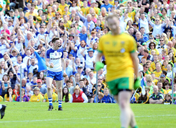 Conor Cleary celebrates at the final whistle with joint manager Donal Moloney and Shane O'Donnell
