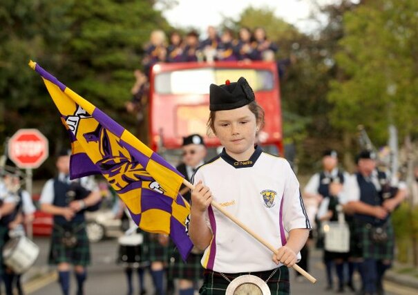 • A young Wexford camogie fan leads the parade during the homecoming on Monday night