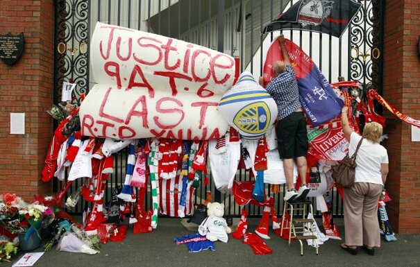 • A man hangs a flag alongside other tributes placed on the Shankly Gates next to the Hillsborough Memorial at Liverpool's Anfield Stadium.