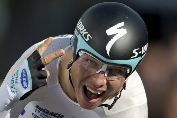 • Tony Martin strains as he crosses the finish line of the men's time trial event of the Road World Championship