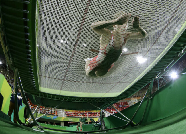Belarus’ Uladzislau Hancharou performs at the trampoline event