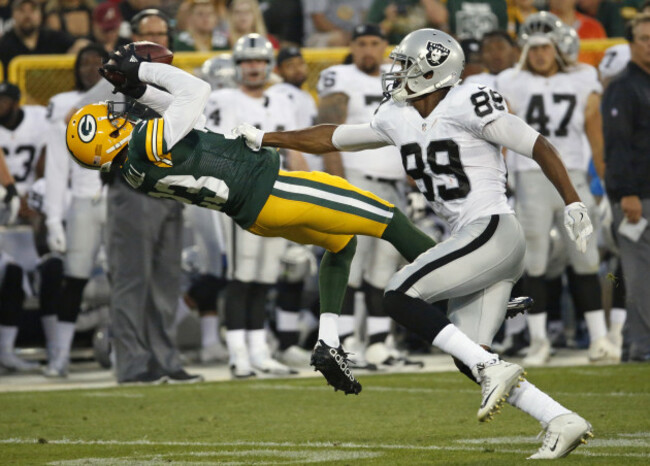 Packers cornerback Damarious Randall (23) intercepts a pass intended for the Oakland Raiders’ Amari Cooper