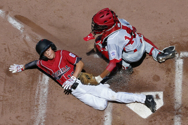 Canada’s Antonio Cusati, left, scores before Japan’s catcher Akira Jozawa can get the tag