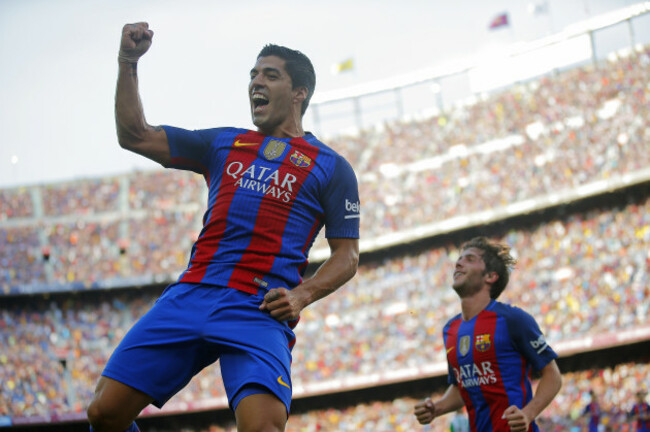 Luis Suarez celebrates after scoring a hat-trick against Real Betis