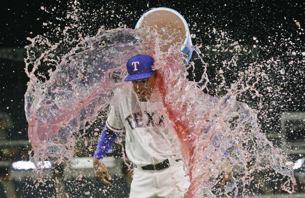 Carlos Gomez takes an early shower.