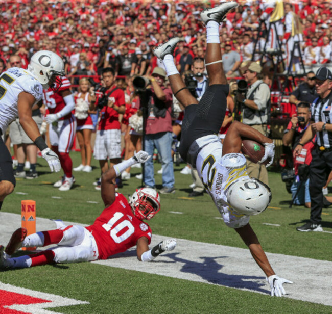 1. Oregon running back Tony Brooks-James (20) scores a touchdown over Nebraska cornerback Joshua Kalu