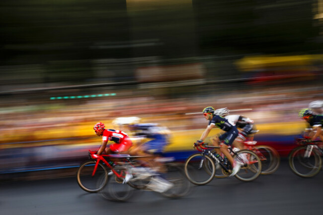 7. Movistar’s Team Nairo Quintna rides wearing the overall red jersey rides to win the Spanish La Vuelta