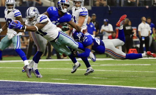 9. Ezekiel Elliott (21) leaps into the end zone for his first-ever NFL touchdown