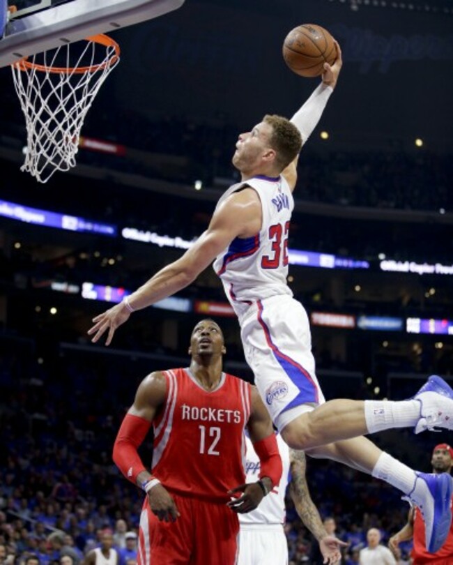 Houston Rockets centre Dwight Howard watches on as Los Angeles Clippers forward Blake Griffin goes in for a dunk.