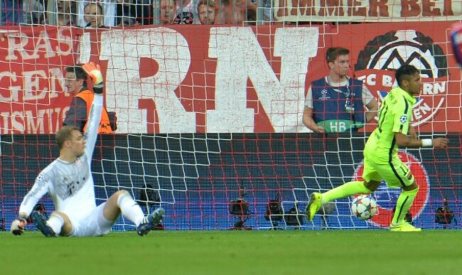 Maunel Neuer appeals for offside after Neymar scores Barcelona’s first goal in the Uefa Champions League semi-final second leg at the Allianz Arena