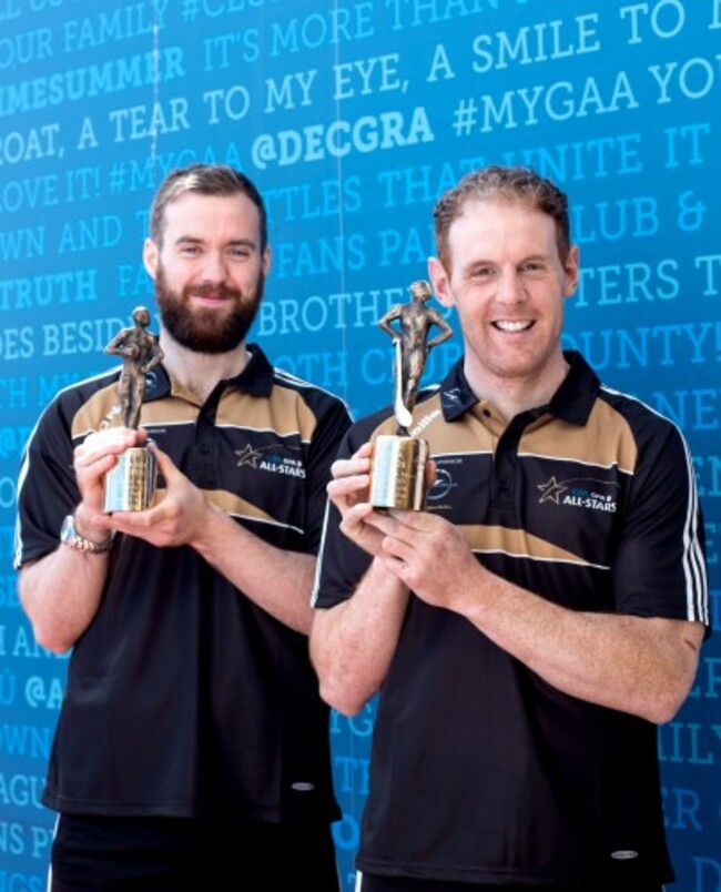 Senan Kilbride of Roscommon and Kevin Moran of Waterford with their respective football and hurling Opel Player Of The Month awards for April.