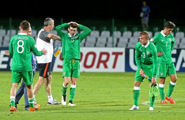 Dejected Irish players after England knocked them out of the Uefa Under 17 European Championship.