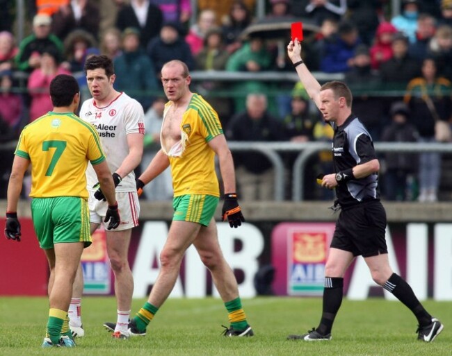 Neil Gallagher — that’s him in the ripped shirt — saw red in Donegal’s Ulster SFC win over Tyrone