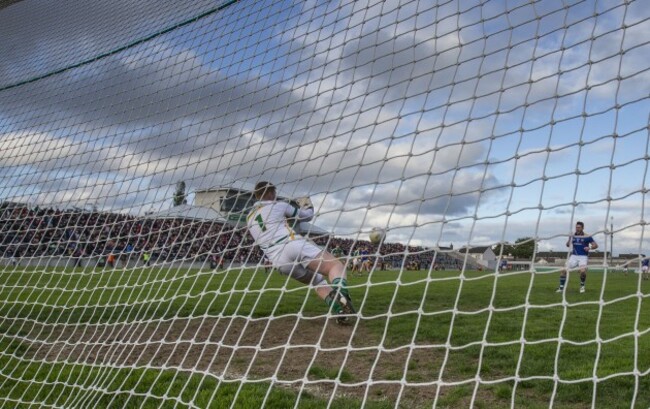 Offaly goalkeeper Alan Mulhall saves a penalty from Longford’s Michael Quinn