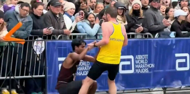 At what marathon did Co Down man Aaron Beggs help an exhausted runner cross the finish line this week?