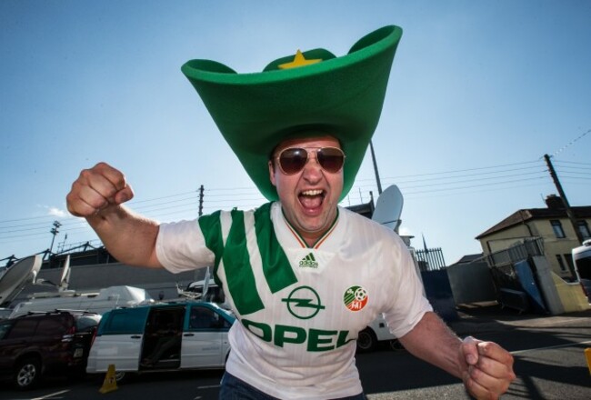 Ireland supporter Ronald O'Regan has his head well protected from the Cork sun ahead of tonight's game against Belarus. Cathal Noonan / INPHO