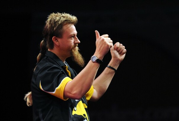 Thumbs up? Thumbs down, sir, thumbs down. Every darts player needs a "thing" and Whitlock made this business up front, party at the back number his.