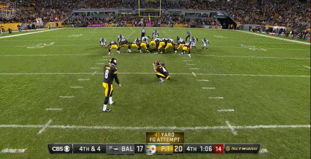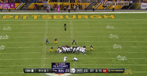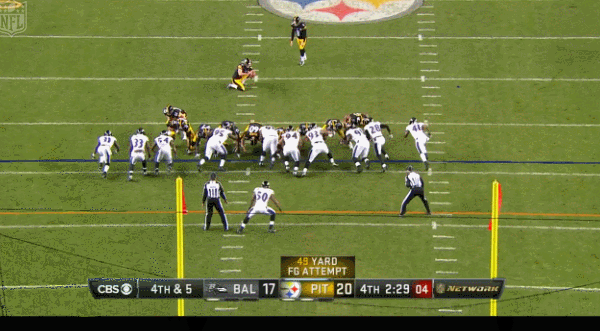 Holding a commanding 20-7 lead in the third quarter, Pittsburgh would fail to score again after Scobee shanked a 49-yard effort with two and a half minutes remaining that would have forced the Ravens to score a touchdown to win the game.