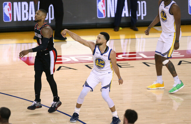 Curry answered with a pair of late three-pointers — abetted by a Lillard turnover — to send the Warriors to the locker-room leading 54-45.