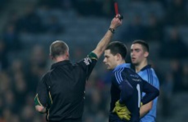 The All-Ireland winning keeper was shown a straight red in the 29th minute for kicking Kevin McLoughlin, leaving the Dubs to play most of the match with 14 men.
