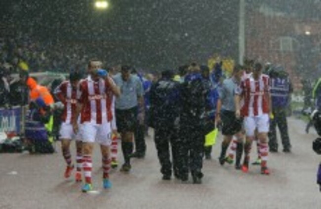 With 28 minutes on the clock at the Britannia Stadium and the score 0-0, a sudden downpour of hail prompted referee Mark Clattenburg to wave the players off to the side of the pitch.
