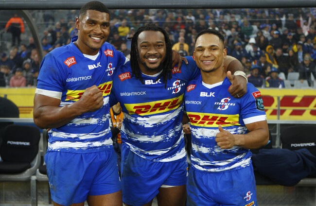 Joseph Dweba (centre) with Damian Willemse and Herschel Jantjies after the Stormers beat Connacht in their semi-final.