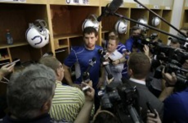 Indianapolis Colts quarterback Andrew Luck is interviewed at his locker following a practice at the NFL team's football rookie mini-camp in Indianapolis this week. Michael Conroy/AP/Press Association Images