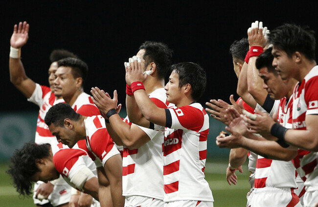 Japan's rugby team greets supporters at the end of their rugby union international match against France at the U Arena. AP/PA Images