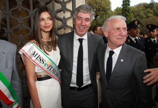 Giovanni Trapattoni and FAI chief executive John Delaney with ‘Miss Italia’ Stefania Bivoni. (©INPHO/Donall Farmer)
