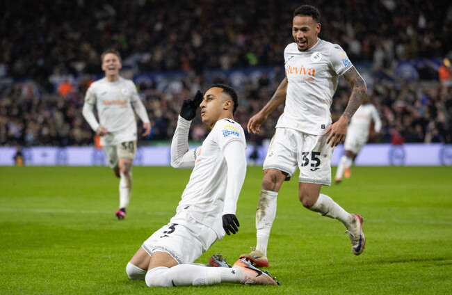Adam Idah of Swansea City (c) celebrates scoring. Alamy Stock Photo