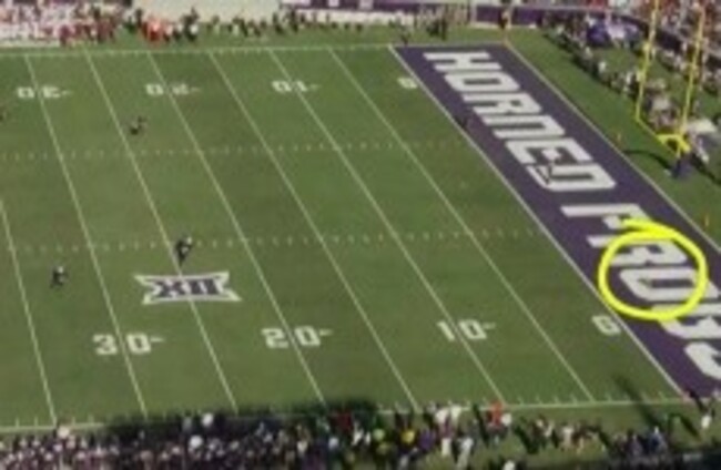 THIS TCU PLAYER certainly knows how to take advantage of his surroundings, hiding within the “O” in the end zone to collect a kick-off return entirely undetected.