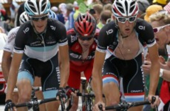Andy (left) and Frank Schleck (right) lead the way from Cadel Evans (centre) during yesterday's stage to Alpe d'Huez. AP Photo/Joel Saget, POOL