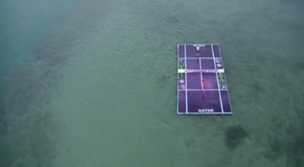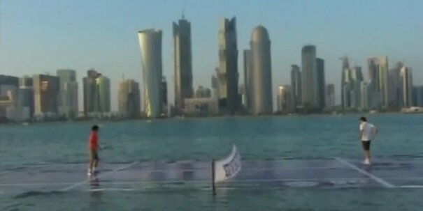 Rafael Nadal and Roger Federer play tennis on a floating court in Qatar
