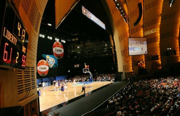 In 2004 the WNBA's New York Liberty played the Detroit Shock on stage at Radio City Music Hall