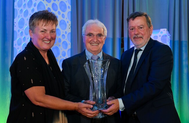 Brother Bernard Twomey (centre) is presented with the Jeremy Dee Services to Women's Football award by Niamh O'Donoghue and Donal Conway of the FAI. Seb Daly/SPORTSFILE