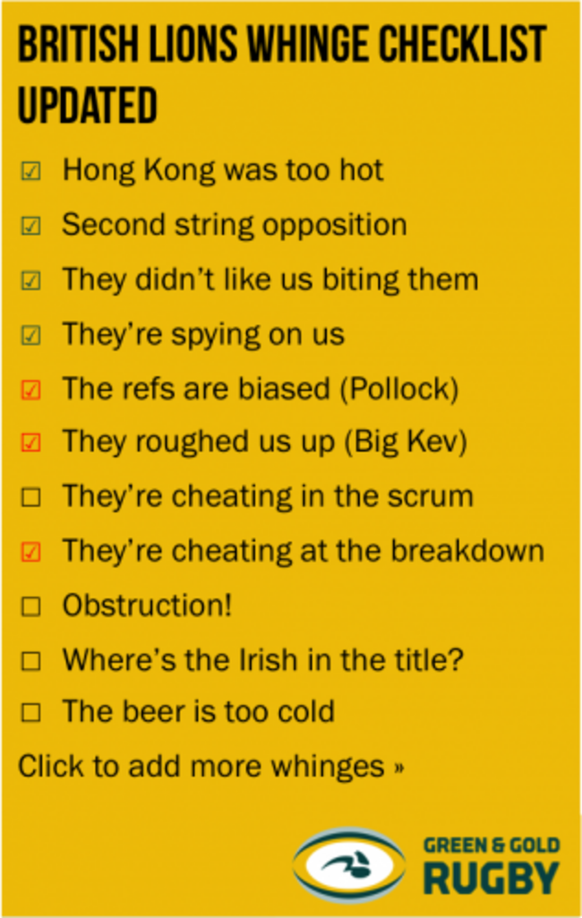 Second, and perhaps more predictably, the Lions Whinge Checklist continues towards completion.
