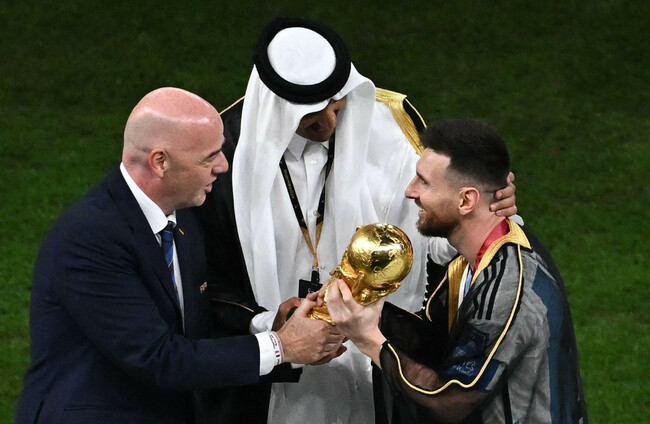 Lionel Messi of Argentina is presented with their FIFA World Cup Qatar 2022 trophy after the team's victory by Gianni Infantino (L), President of FIFA and Tamim bin Hamad Al Thani (C), Emir of Qatar. Alamy Stock Photo