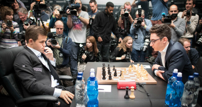 Reigning FIDE world chess champion Magnus Carlsen (left) and challenger Fabiano Caruana competing in the World Championships earlier this day. PA Wire/PA Images