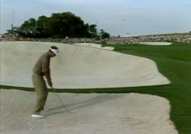 2. With about 150 yards to the pin, Lyle took aim and fired. As soon as the ball left the face of his club, he was up out of the bunker after it.