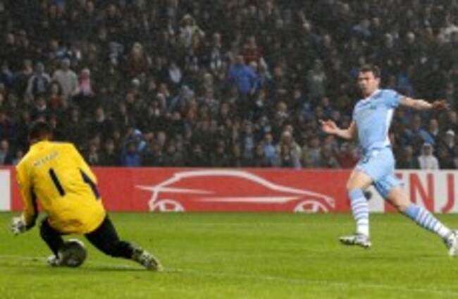 Edin Dzeko (right) shoots to score Manchester City's second goal past FC Porto's goalkeeper Da Silva Helton. Dave Thompson/PA Wire/Press Association Images