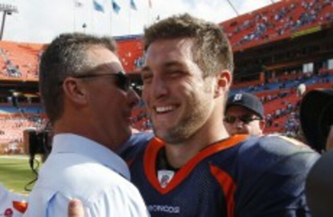 Tim Tebow, right, gets a hug from his college coach at Florida, Urban Meyer, after the Broncos defeated the Miami Dolphins 18-15 in overtime on Sunday. Hans Deryk/AP/Press Association Images
