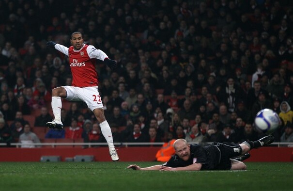 Gael Clichy scores Arsenal's fifth against Leyton Orient on Wednesday night.Source: Nick Potts/PA Wire/Press Association Images