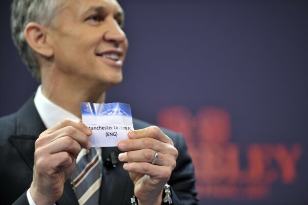 Gary Lineker shows the ticket of Manchester United FC during the draw of the UEFA Champions League quarter-finals and semi-finals at the UEFA headquarters in Nyon. Source: AP Photo/Keystone, Martial Trezzini