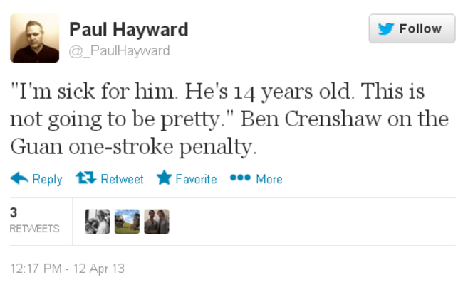 The youngster and playing partners Ben Crenshaw and Matteo Manassero had been warned that they were on the clock earlier in the round. Although Guan parred the hole in four, he was penalised a stroke and scored with a bogey five .