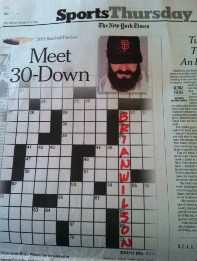 1. “Brian Wilson, the one-of-a-kind closer for the champion San Francisco Giants, has an abiding interest in crossword puzzles. He said that he started doing The New York Times crossword when he was 12, that he remembered “there would always be a sports star in there” and that he thought that one day he might succeed as a baseball player and then maybe he could be a clue, too. Now he is, just in time for opening day.”