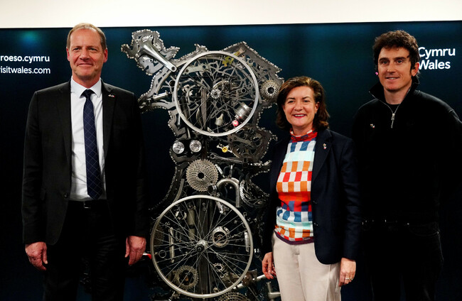First Minister of Wales Eluned Morgan (centre), Tour de France 2018 winner Geraint Thomas (right), and Director of the Tour de France Christian Prudhomme during the Tour de France 2027 Grand Depart Route Reveal. Alamy Stock Photo