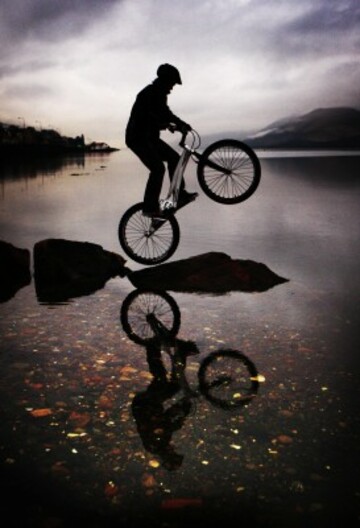 British Trials Champion Gary MacDonald reflected in Loch Linnhe in Scotland during the launch of the tenth Fort William Mountain Festival.