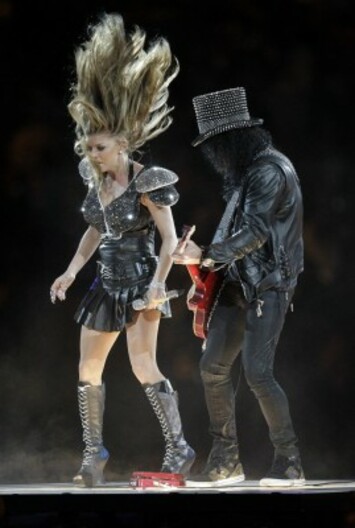 The day the music died: Fergie from the Black Eyed Peas duets with Slash of Gun'n'Roses at the Super Bowl half-time show.