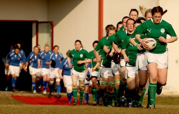 Captain Fiona Coghlan leads out her Ireland team for their Women's Six Nations Championship opener in Rovigo. Source: INPHO/James Crombie