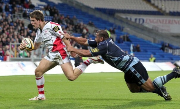 Ulster's Craig Gilroy brushes off a tackle of Cardiff's Taufa'ao Filise to score during their Magners League clash. Gilroy grabbed a brace of tries on his debut to inspire his side to a 37-15 bonus-point win.